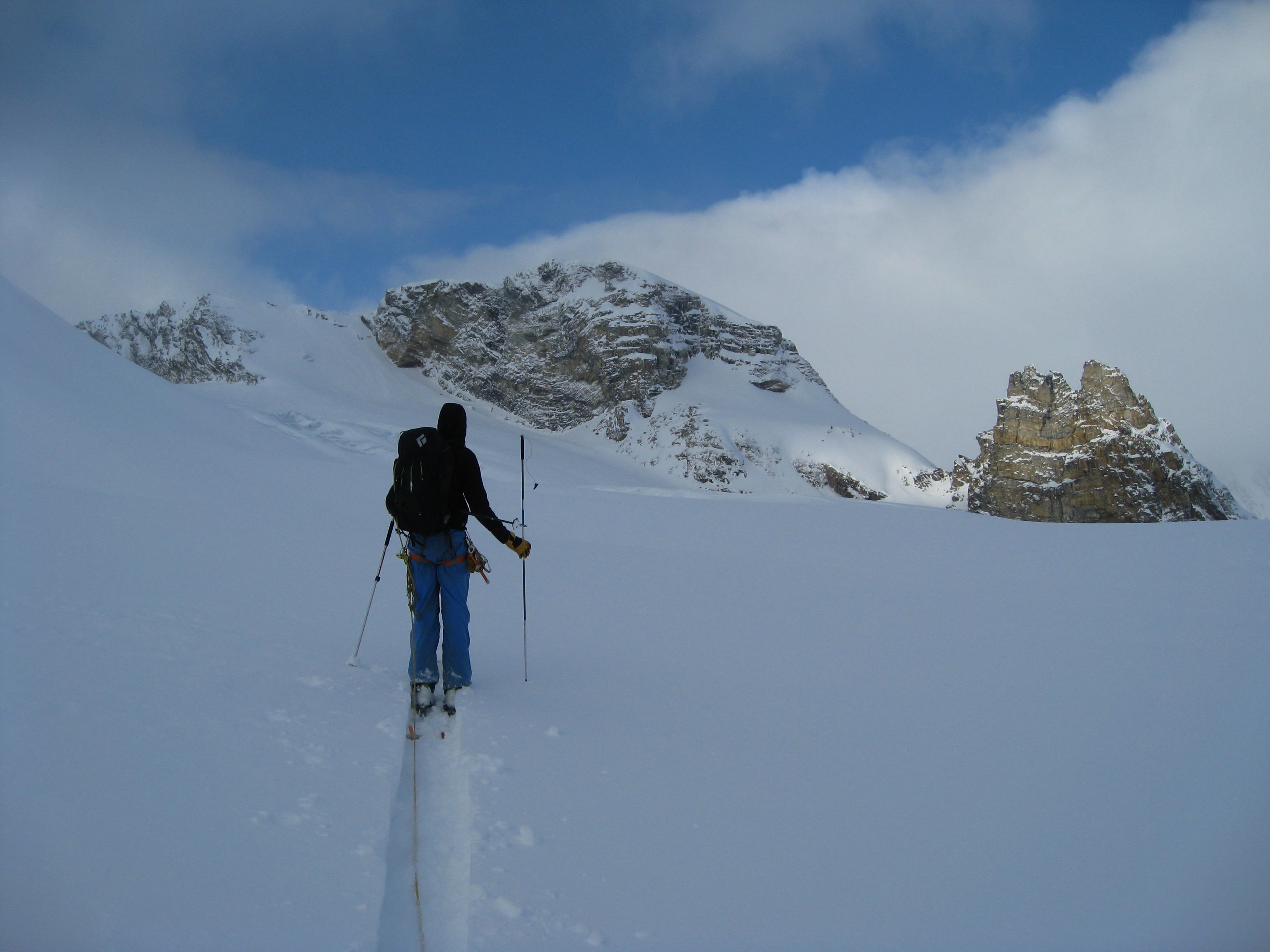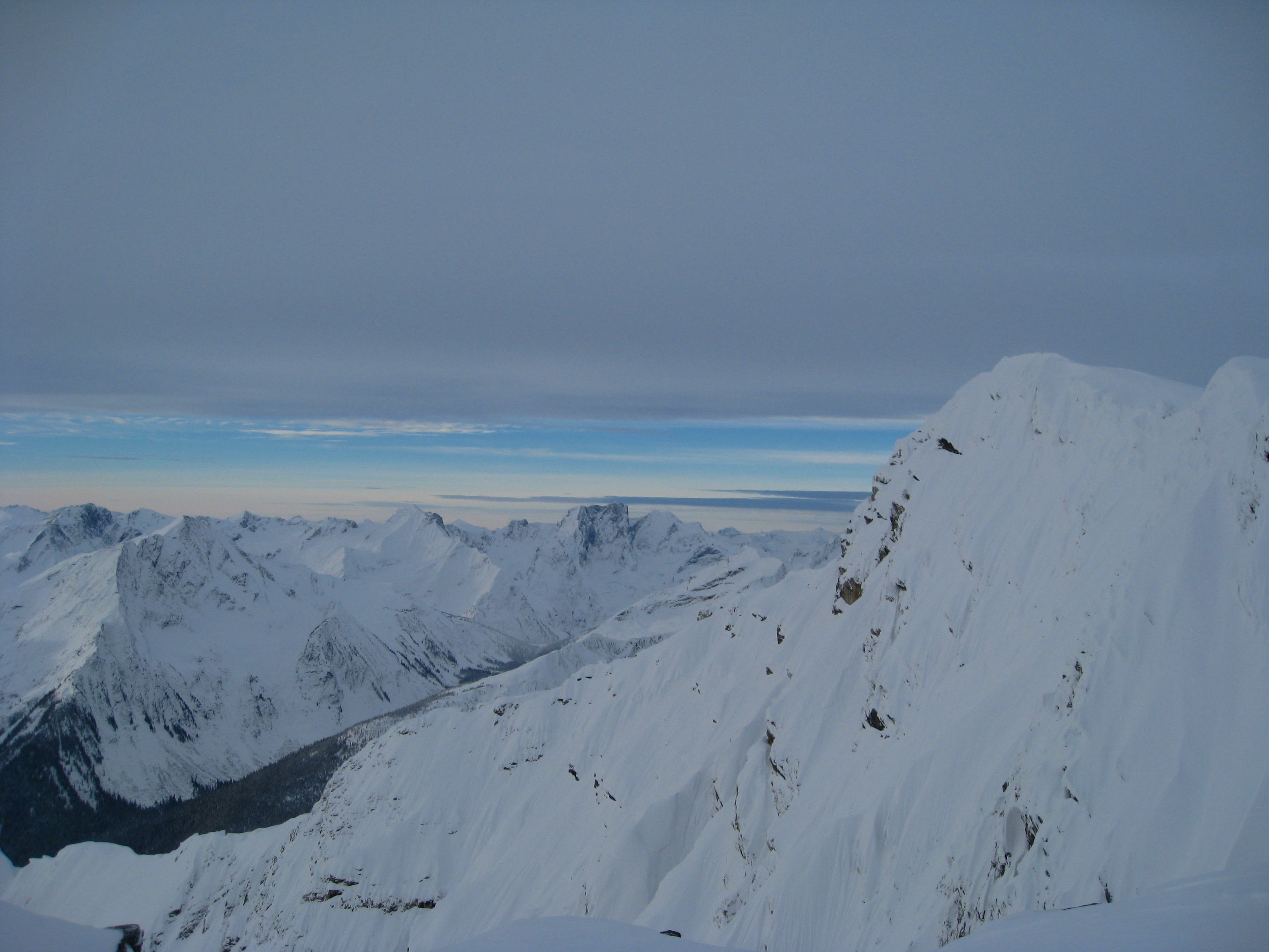 With hopes for better light, the next day was devoted to the exploration of Broadway, a ramp which provides an ideal route up the Nordic Glacier, home of some excellent alpine runs and mountaineering objectives. Once we roped up and probed a comfortable skintrack, we enjoyed several hours of gale force ridgetop winds while bagging the skier’s summit of Nordic Peak. The face, and its boot top dust on crust was perfect for some high speed GS turns, and made the day’s windburn utterly worth it. Wedding Bells, a steep ramp on the side of Escargot Peak provided the icing on the cake.