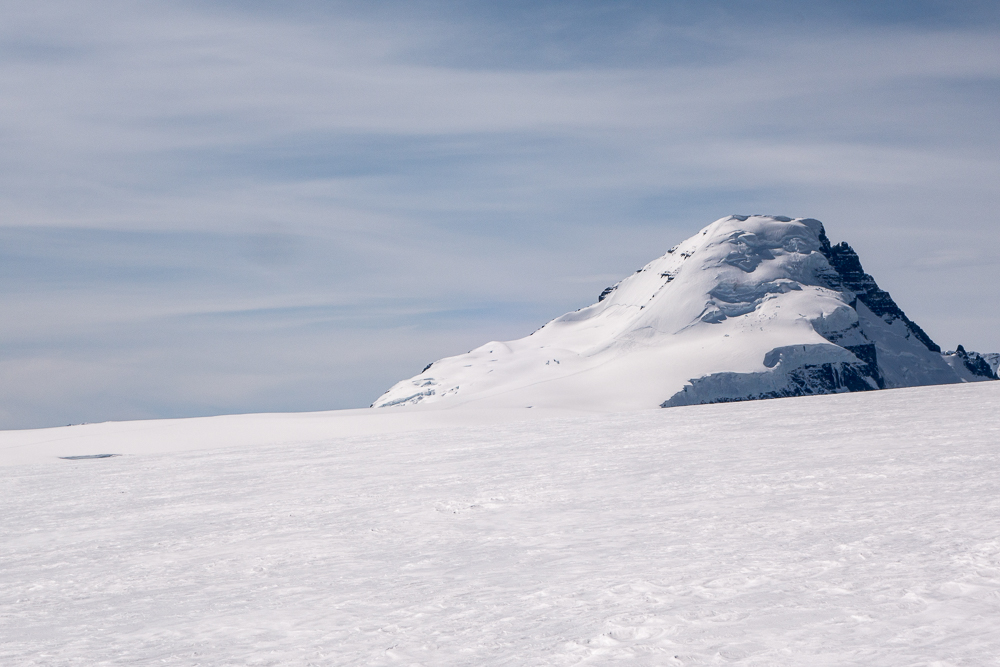 Mt. Columbia is visible from nearly anywhere on the icefield, yet never seems to get any closer. It’s incredible, but demoralizing. Although we knew it would be further than it looked, it still took considerably longer to get to the bottom of the east face than either of us had guessed. The face featured an ugly, refrozen bootpack that we took turns improving. Chalk it up to a slightly higher altitude than usual, not sleeping, walking really far, whatever but I was feeling surprisingly crushed at this point. While Luke powered ahead, I had a drink and rested my head on my ice axe for a minute. In response, the wind stole my hat and whipped it off towards the Black Hole. I learned my lesson about resting and suffered up to the summit, arriving around 11:40.