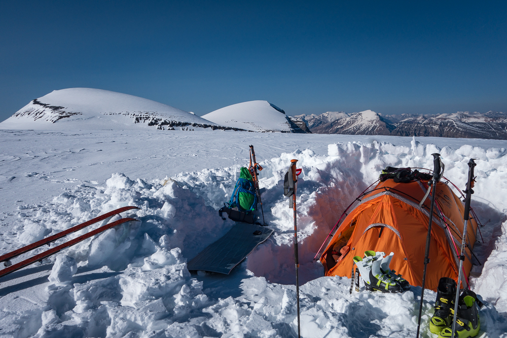 Once on the icefield, we had some lunch in the sun before setting off down its northern arm, which is absolutely enormous. In what I’ve learned is classic Columbia style, it rolls and undulates as far as the eye can see, with no kind of markers for scale. We trudged our way down there for a good long while, setting a skintrack towards The Twins and feeling like we were going nowhere. Finally, as the evening started to cool we made camp near the base of North Twin, atop a ‘low’ 3300m bump – a position we reasoned would cause us to receive the morning sunlight just a little earlier than the Twins – Stutfield col.