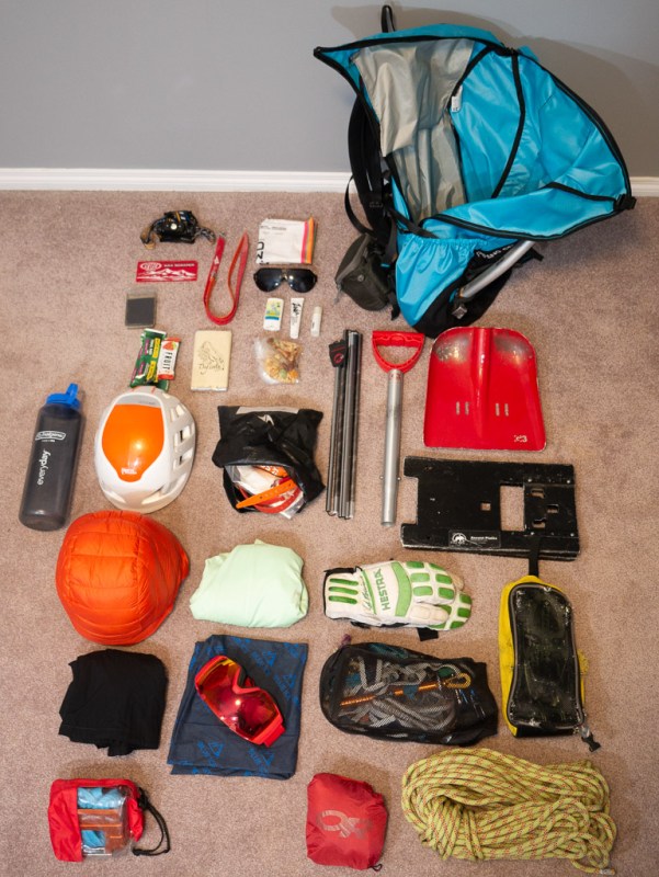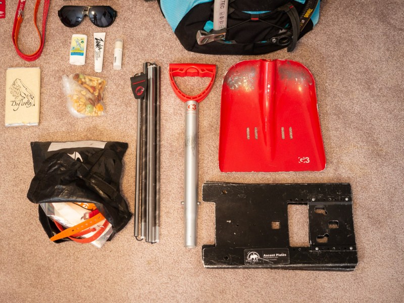 Today I’m unpacking my pack onto the floor so I can show you what’s in there. People always seem to be curious about what gear I’m using and why, and I know I’ve gotten a lot out of reading other peoples’ gear lists. Plus it’s a great way to plug Ski Uphill, who in addition to being my friends and ski partners, have supported me since they opened. I’ll link to products I use that are available there. I’m not completely impartial, but I’m also in no way obligated to use products they carry.