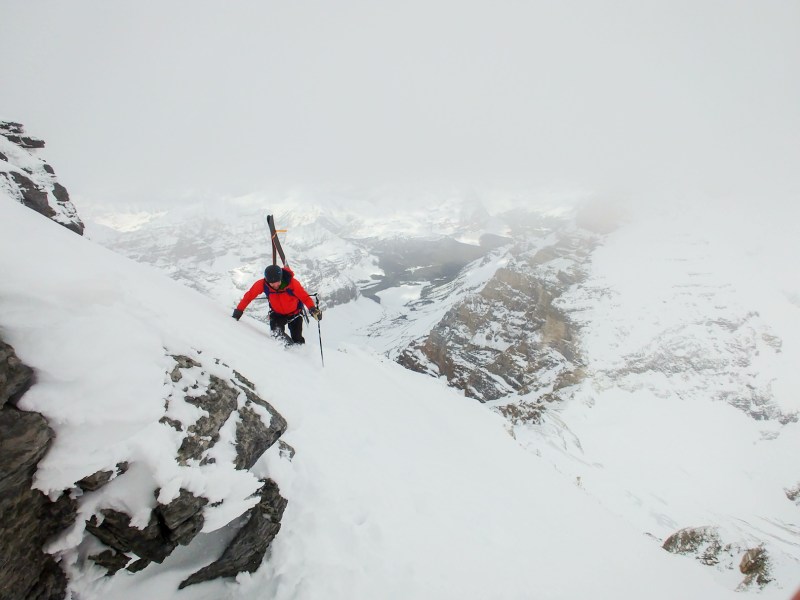 We continued to within sight of the false summit which represents the top of the skiable line. Only a few meters from topping out, the snow depth dropped to only 10 or 15cm over hard alpine ice. The snow itself felt like one cohesive windslab – the kind that might just propagate and sweep us both into the void. I’ve learned to be very wary of those. On a nicer day we might have thrown in a few screws to protect the pitch and made for the summit, but the weather had just rolled in and we decided that was enough mountaineering for us.