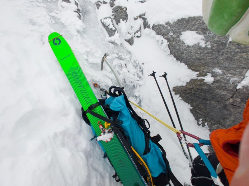 It’s actually a pretty simple ascent – more straightforward than we were expecting. After trading leads for a while, we arrived at the connector choke referenced by Trevor Sexsmith here. This proved in better shape than he found it, and we noted that it would be perfectly skiable on the way down. Like Trevor, this was where we chose to pull the axes out – it’s the first bit of the face that feels particularly technical.