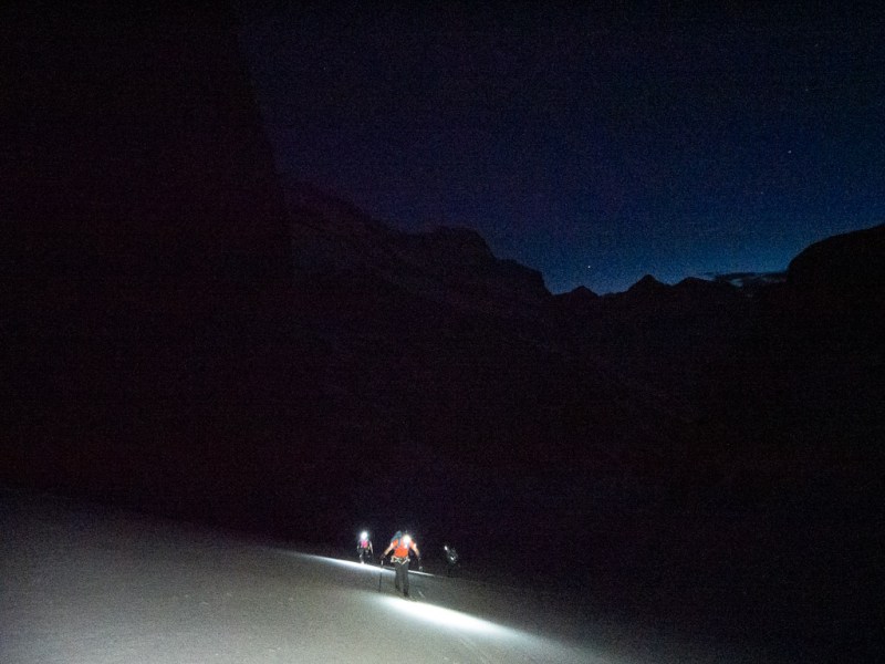 A few days later, another window appeared. Wary of further skunking, we set out even earlier. The crew had grown by one, with aerobic monster Kylee bringing some serious bootpack crushing chops to the party. This time the 1:30 AM darkness was splitter – not even a wisp of cloud. There was a far better freeze in the moraines and things were looking very promising indeed as we rounded the corner into the Deathtrap – the first difficulty of many on the day.