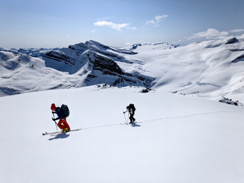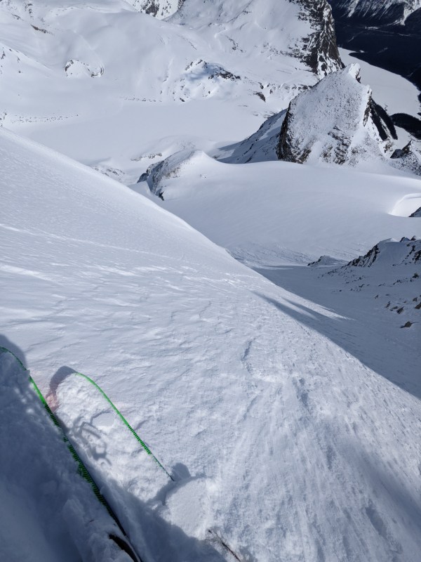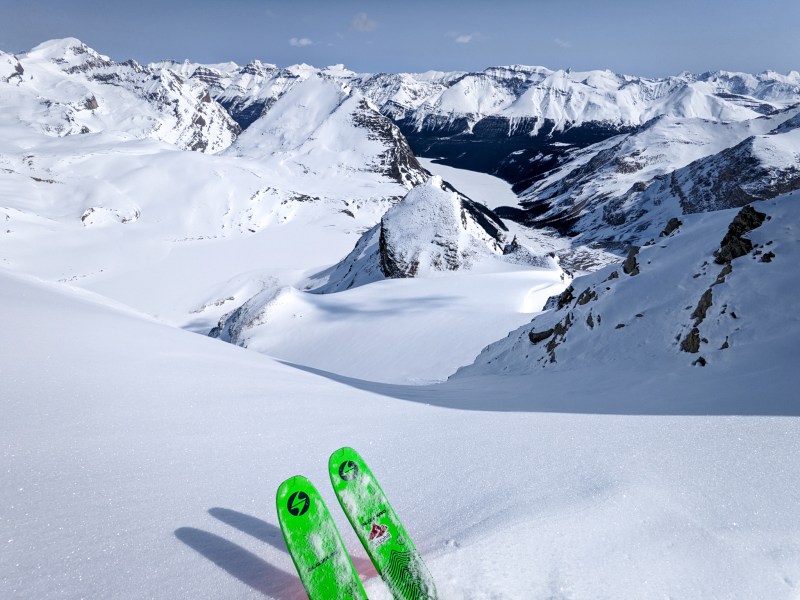 The whole face is only a few hundred meters long, which means you can ski it pretty hard and still have plenty of control to hop over the bergschrund. Becca and James followed me down, and we all regrouped on the flats. There’s a good exit couloir on the other side, accessed by a small side step. The top of that was very thin indeed, but below there was enough hot pow for all. Soon we were reversing our track up the moraines and shortly after that, the flat slog back across Peyto Lake. Which was now a bit of a chore, as it was definitely too soft to skate.