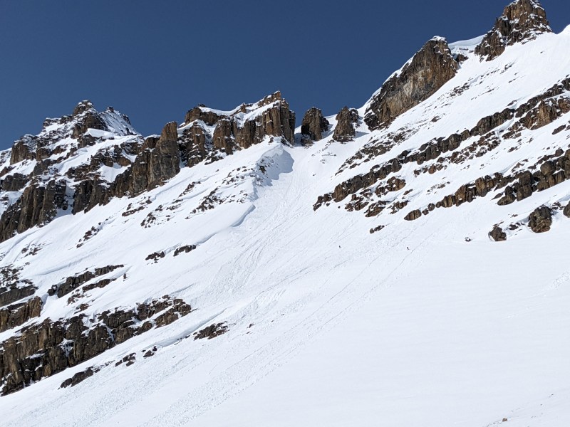 Next up, dealing with the entrance. There’s a pretty significant roll up there and James – who had skied the line before – had entered on belay previously. A fine backup plan, but it’s nicer to cruise right in if you’re comfortable with the conditions. I found a block to climb and look down into the face, where I spotted a rib that I could ski cut to. Everyone got changed over, and I made the cut, knocking a little slough down and testing the short face enough for my liking. Since I made the cut, I got to ski first, rounding out the biggest turns I could manage without my boot tongues; which I’d forgotten in the car.