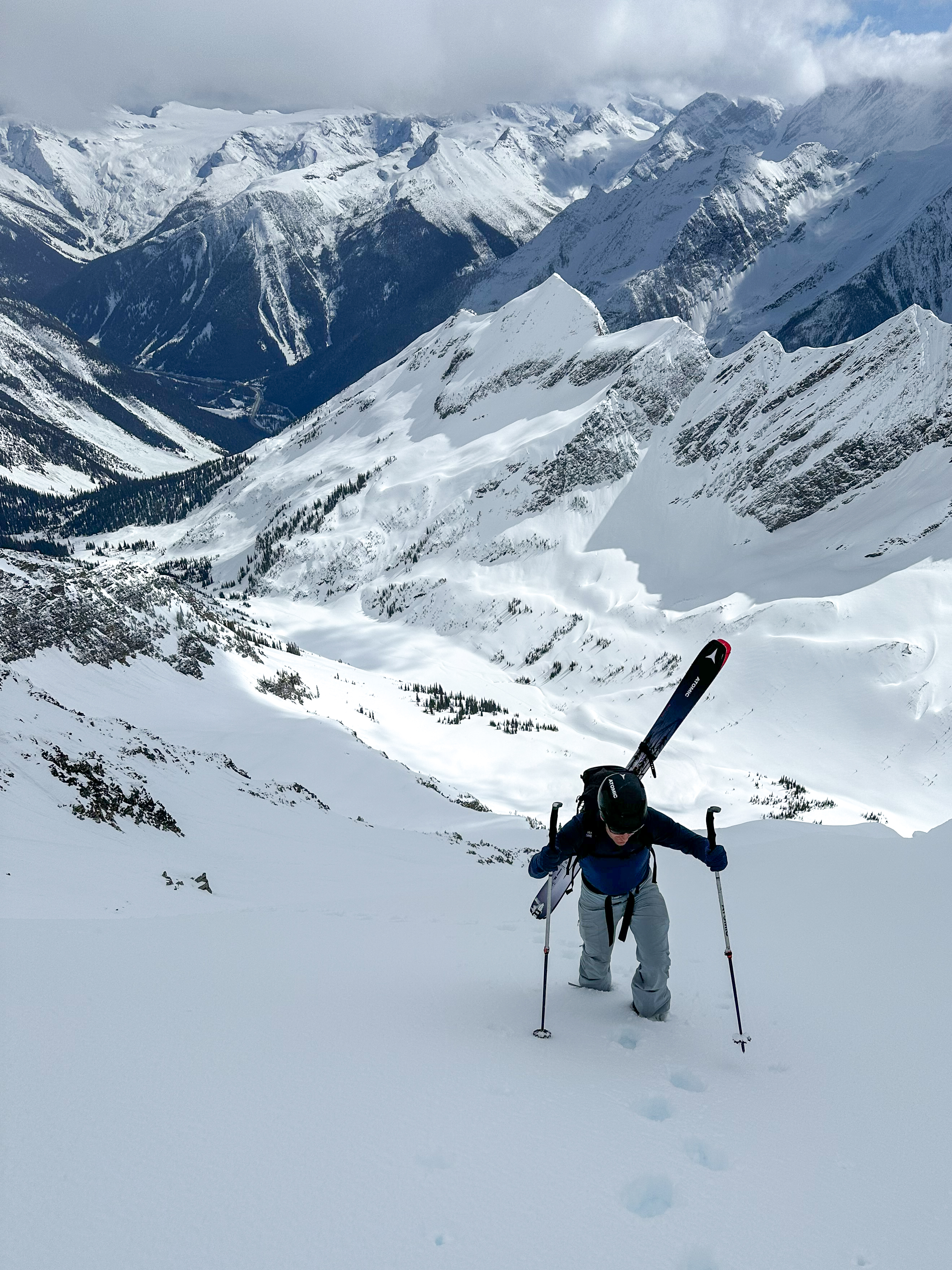 The line skis in stages. First, a tight, uniform couloir, which held glorious snow and felt pleasantly protected. Then an open face, which carries a double fall line in the standard Rogers Pass north face style above an indeterminate amount of exposure. Finally a second exit couloir to the skier’s right of the face. We traded pitches all the way down and enjoyed excellent skiing the entire way – though we were pretty wary of windslabs on the face.
