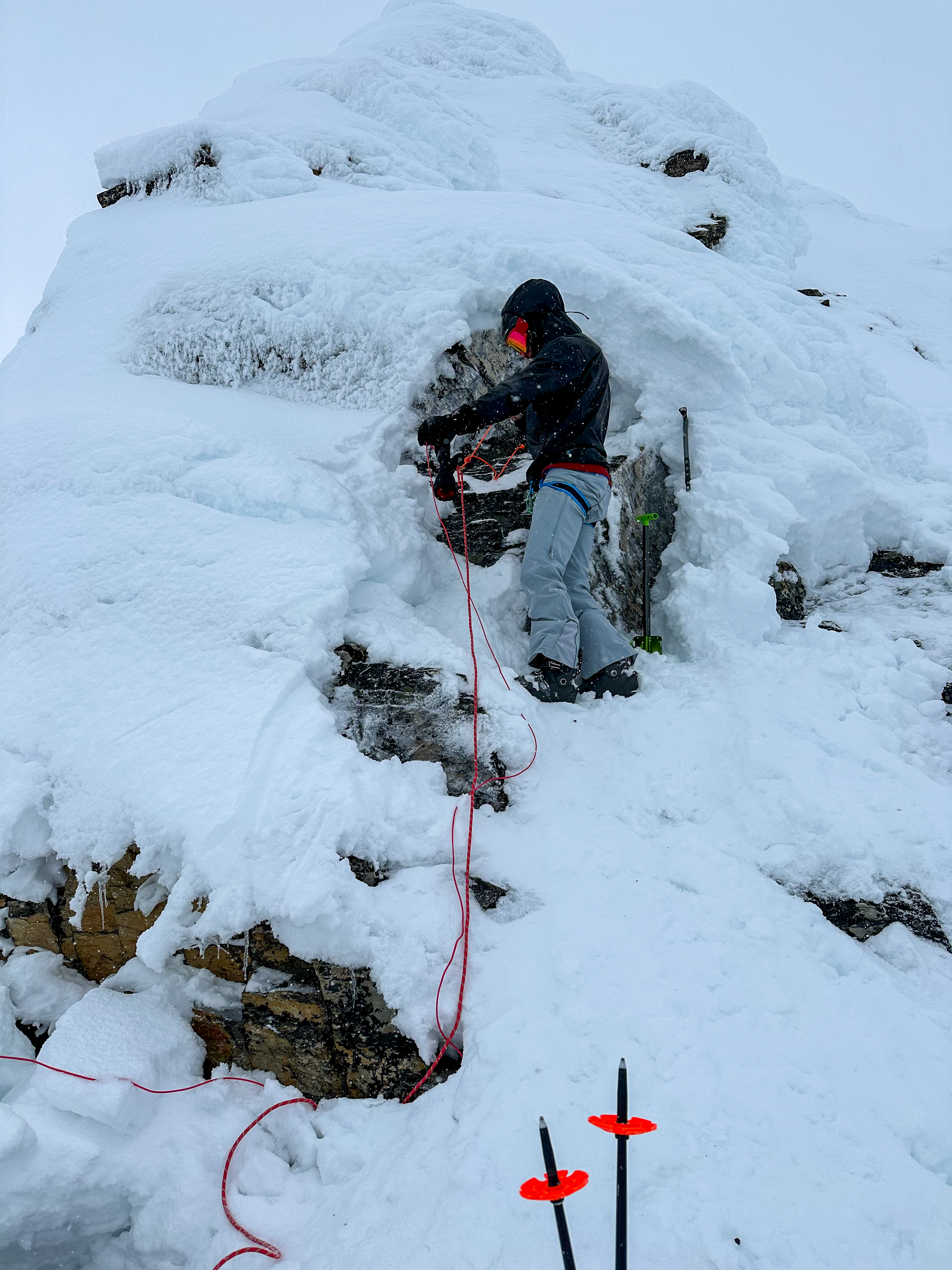 It actually took me a second to verify we were in the right spot, as the other side of the mountain fell away so sharply that my brain initially registered it as pure exposure. But nope, there was a couloir in there! First though, about 20m of what appeared to be free hanging rappel. I love skiing with Mark, because he’s incredibly skilled at anchor building (and every other mountain skill), and because he has a long standing public offer to pay for a second piece gear to back up rappels for people under 30. I’m still a couple of years away from aging out of that, so every time we rap I like to joke that I’m saving him admin time by just using his gear for the anchor up front. We whacked in a couple of great pieces and Mark disappeared over the edge of the cornice in hilarious fashion, cackling madly with his skis fully above his head before sliding into the abyss.