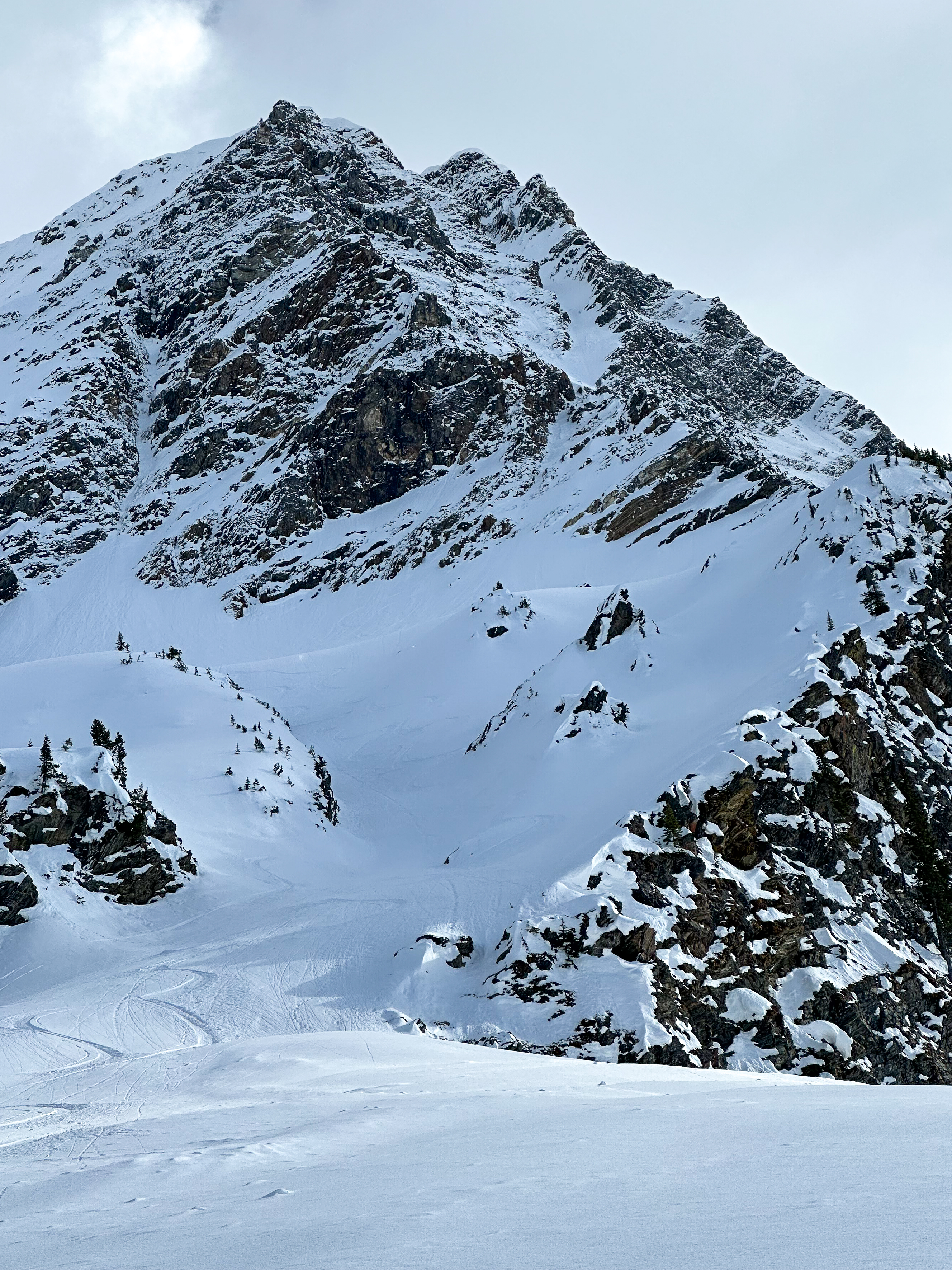 For various reasons, spring 2023 didn’t line up all that well for me. I spent a month in Europe racing skimo and absolutely cracked myself pushing hard day after day. I got sick partway through the Pierra Menta stage race and came home in March to a spectacular weather and stability window that I just couldn’t take advantage of. But, as that window was drawing to a close, I got a few days in and started to get a feel for the snowpack. And what I was feeling was good. So Mark Smiley and I decided to line up something a little bigger: the striking couloir that bisects Bagheera Mountain’s formidable north face more or less from the summit.