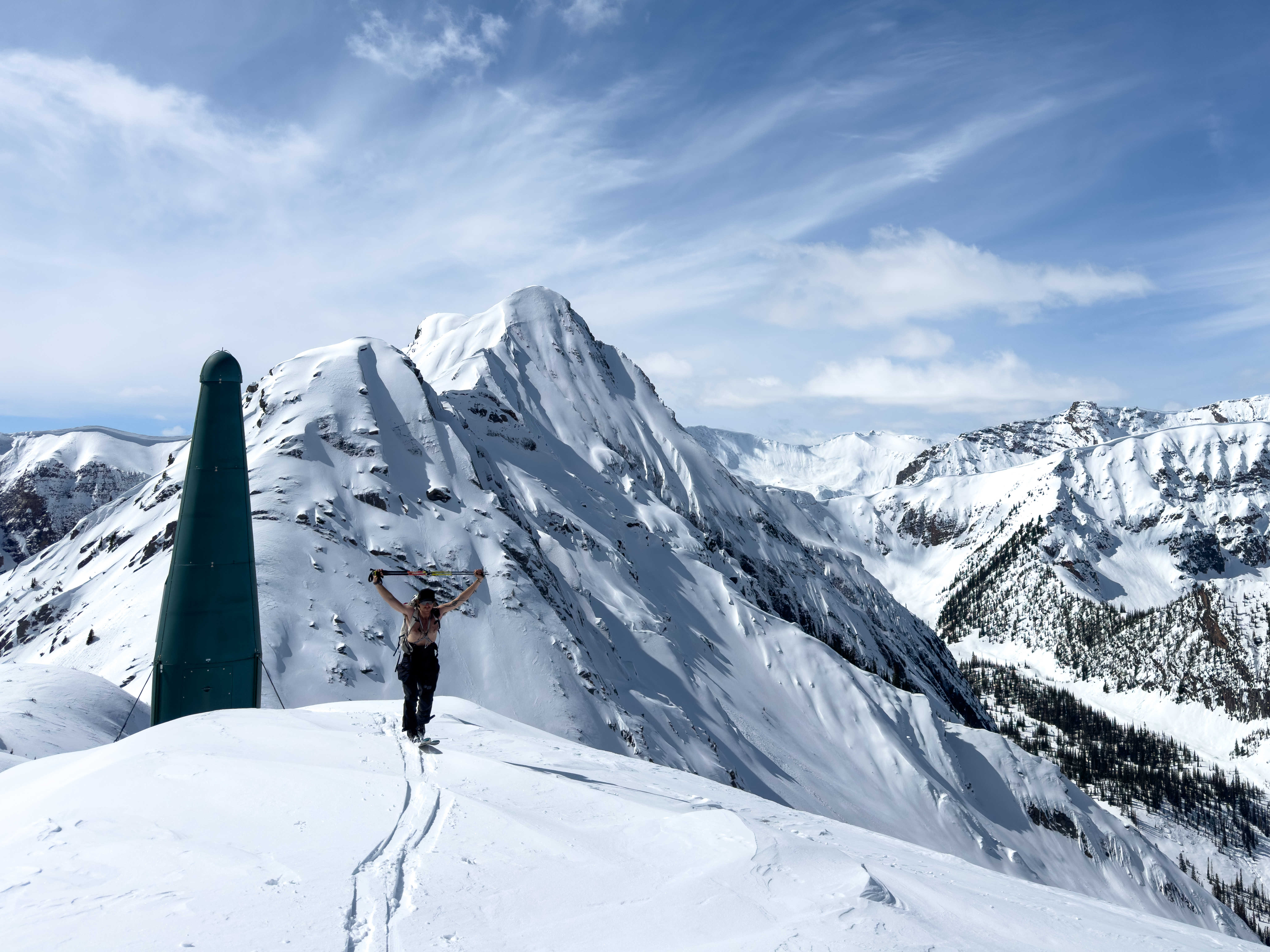 Skiing from the highest point of perhaps the most visually arresting peak around town seemed like a great choice, and its striking north couloir was ideal for the warm temperatures and winter-to-spring transitional snowpack we were experiencing. We approached from the parking lot at Kicking Horse, following the slackcountry ski out to Repeater Ridge. This is always a surprisingly quick route, and within two hours we were standing in the Holt Creek drainage after a pretty crusty ski down from the ridge.