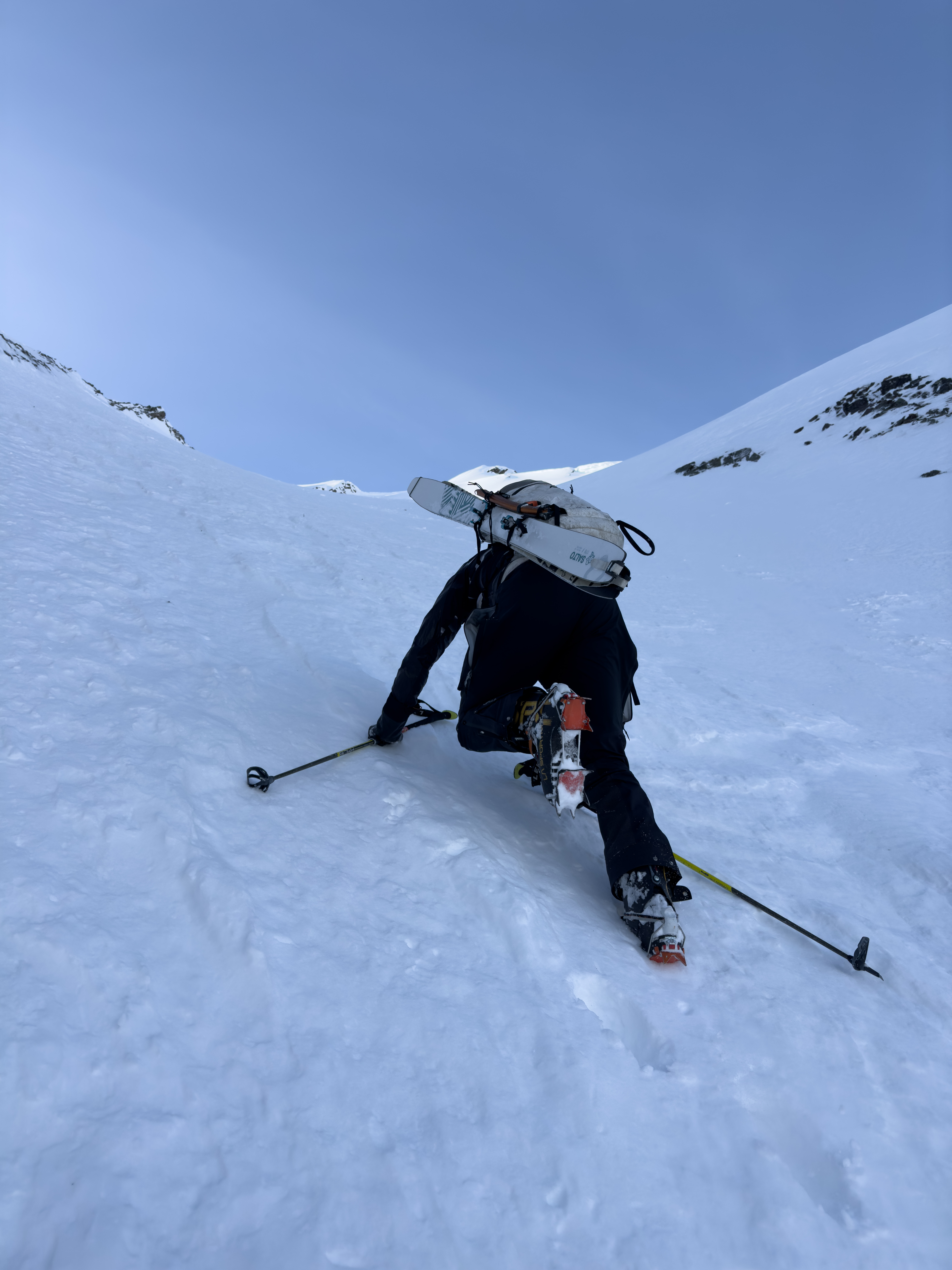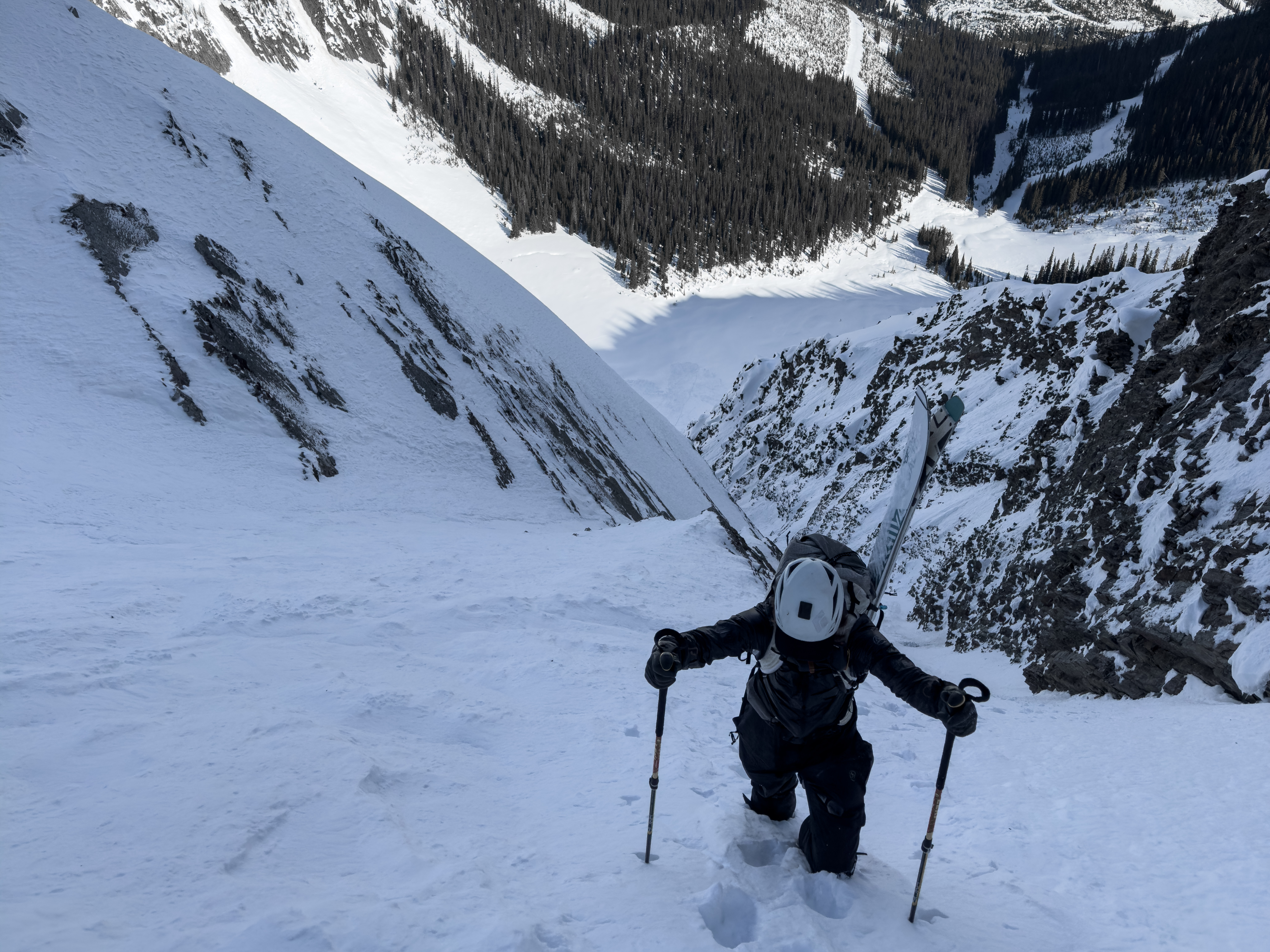 Partway up the gently curving lower couloir, we started to think that maybe the snow was going to be a bit better than advertised. Above the crux of the line we became quite sure, although the transition back to soft snow and pockets of isolated windslab in such an exposed spot didn’t quite fill us with gratitude. The crux is a steep constriction in the couloir, above which the line opens into a face and a distinct convexity. It’s the kind of terrain that has you committed by the time you can fully assess it. So after some discussion, first Mikey, then I tiptoed across a few meters of spooky roll, before the terrain regained its support and the pressure was off again.
