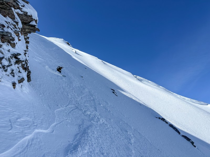 There would be an argument for climbing the south side and skiing this line top down, we decided aloud as we crested the ridge and looked back towards the resort. Much colder conditions would be required though, and we were pretty happy not to be on that south slope. Our mere presence was triggering rollers and small sloughs on the rapidly warming face. Facets and a spooky cornice prevented us from achieving the true summit, but we were still comfortably on top of the line when we dropped in.