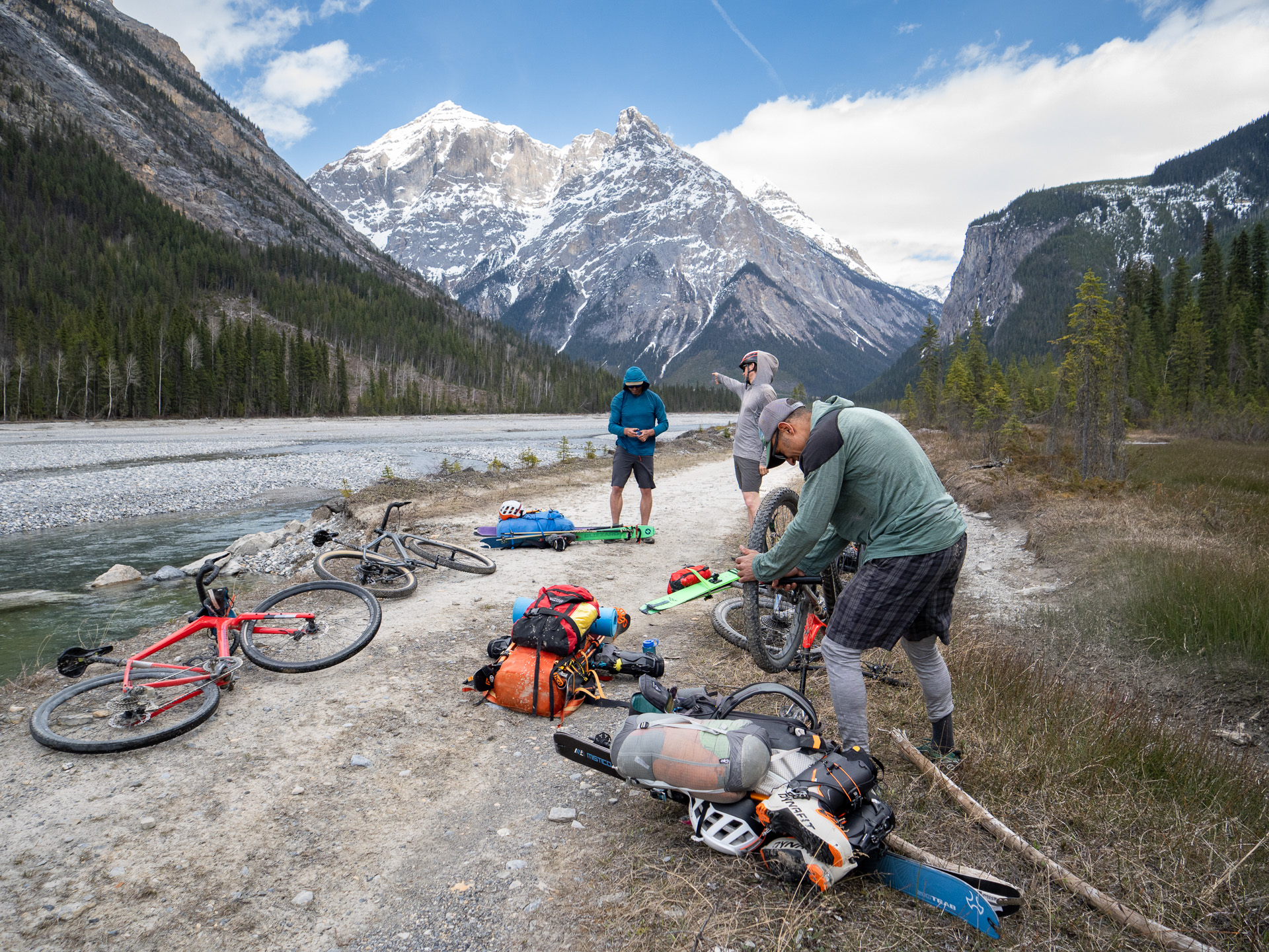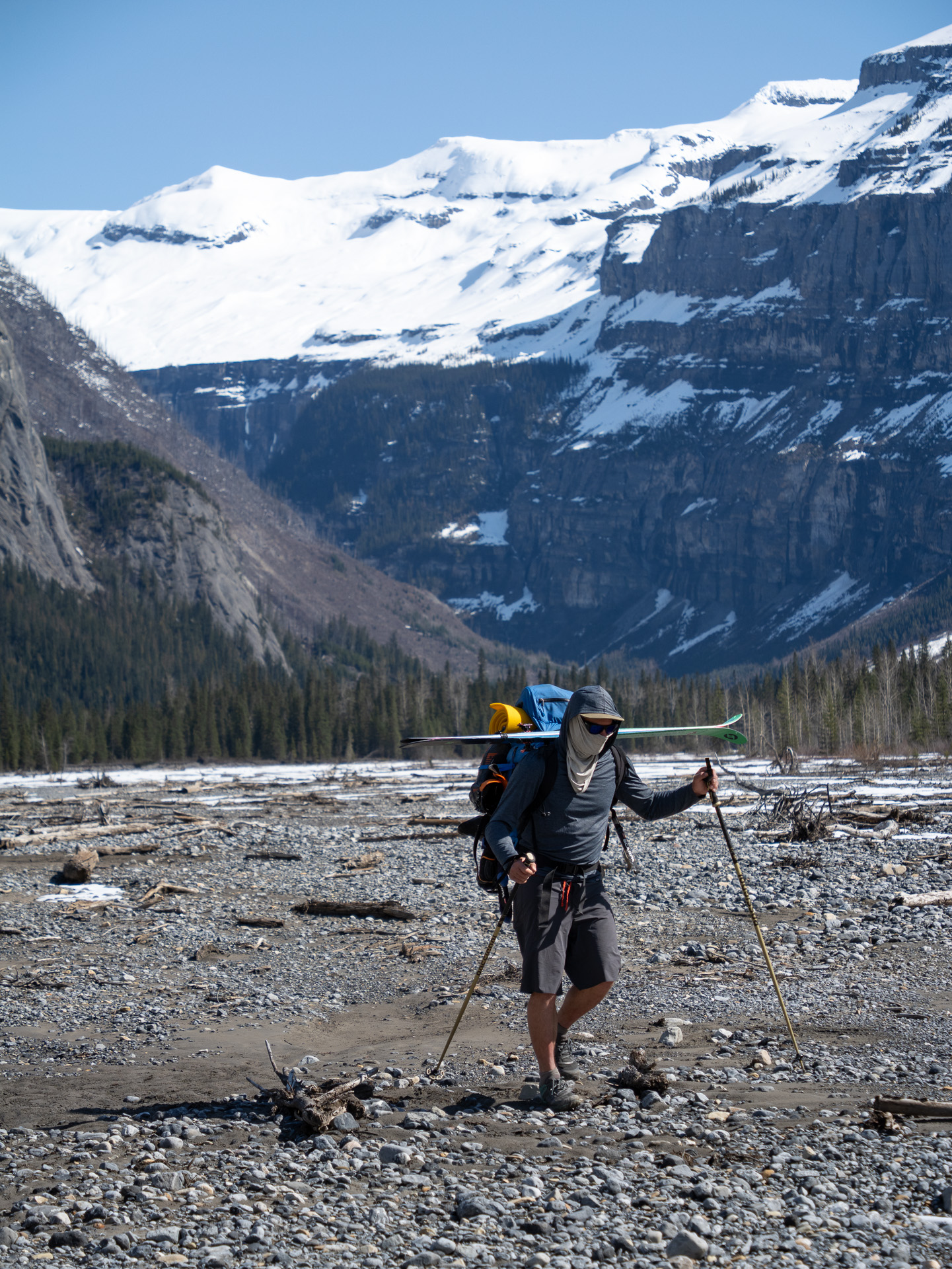 We stashed our bikes and crossed Icefall Brook’s wide gravel flats around the point where the flats, the west couloirs on Mt. Arras and the road all come together. From there it was surprisingly easy travel up the bouldery canyon that leads into the valley itself. No bushwhacking required as we reached the snow line at the top of the canyon and switched to skinning. As night fell, we built ourselves a comfortably bivy spot near treeline. It was a bit later than planned, but considering how far we had deviated from the original idea, things were going pretty damn well. After a fine day’s work, the team was perfectly positioned for an ascent of the Diamond Spur route on Icefall in the morning. We all slept like logs.