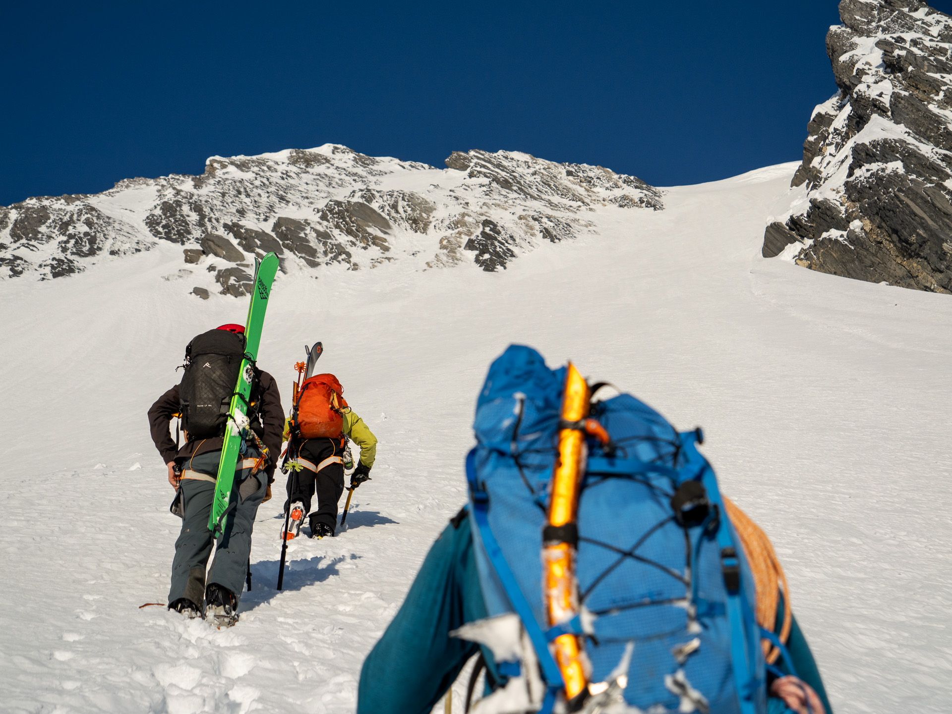We were all pretty blown away that it allegedly hadn’t been skied, to the point where we all but assumed that it couldn’t be true. Our exit back over a col between Icefall and Ruby peaks was pretty straightforward, which gave us plenty of time to discuss the subject while looking back over at our tracks. Andrew hopped on a rope and found a diagonal gash leading back down to the Diamond Glacier. That was a bit lucky, as the col we were on was not the one we thought we’d been aiming for. Regardless, we skied back down the solar couloir without incident, but without much time to spare either. It was still only noonish, but things were getting hot. There was certainly no time to ski anything else of interest, but we did get a corn lap on the moraines to keep us entertained.