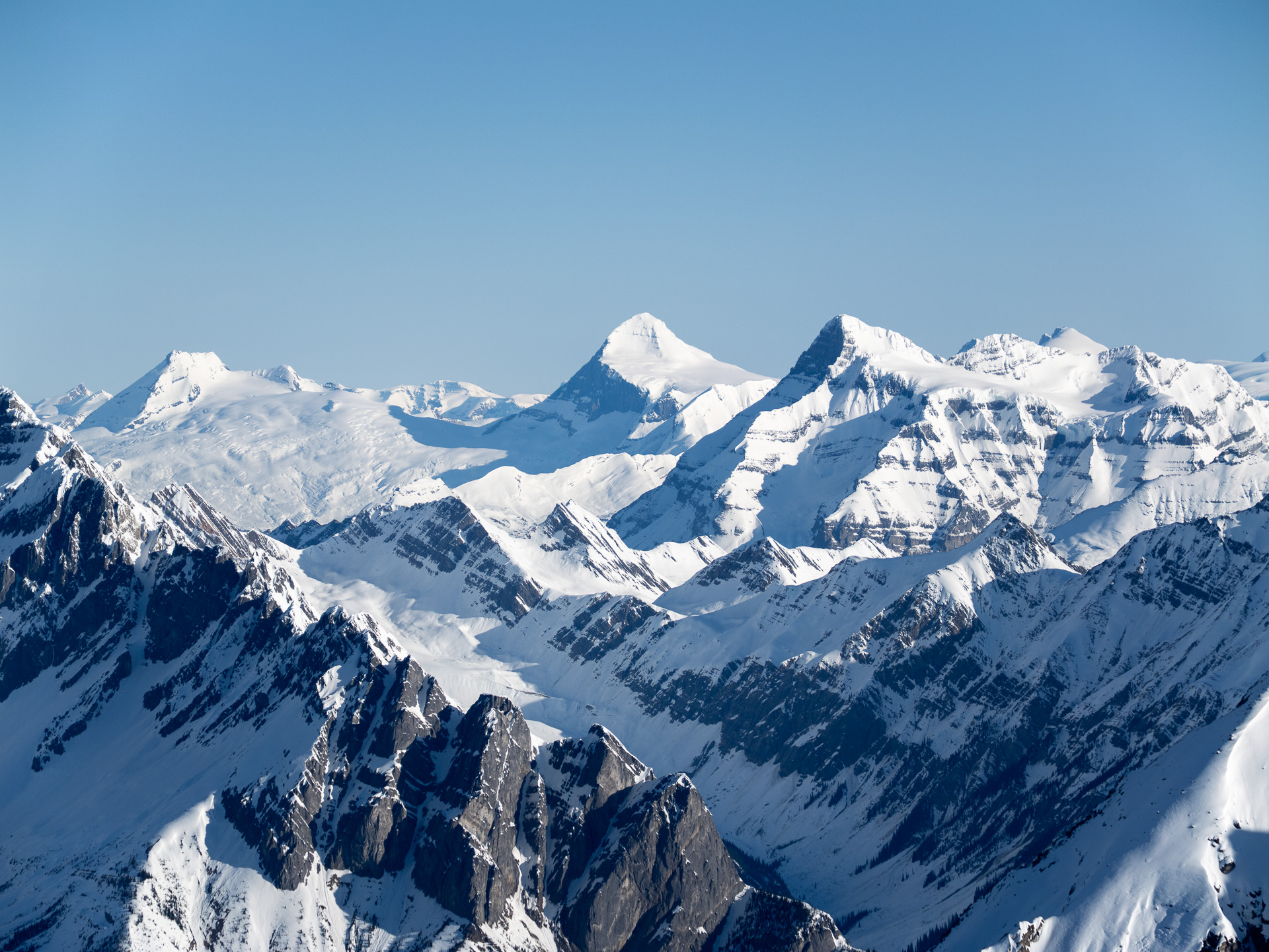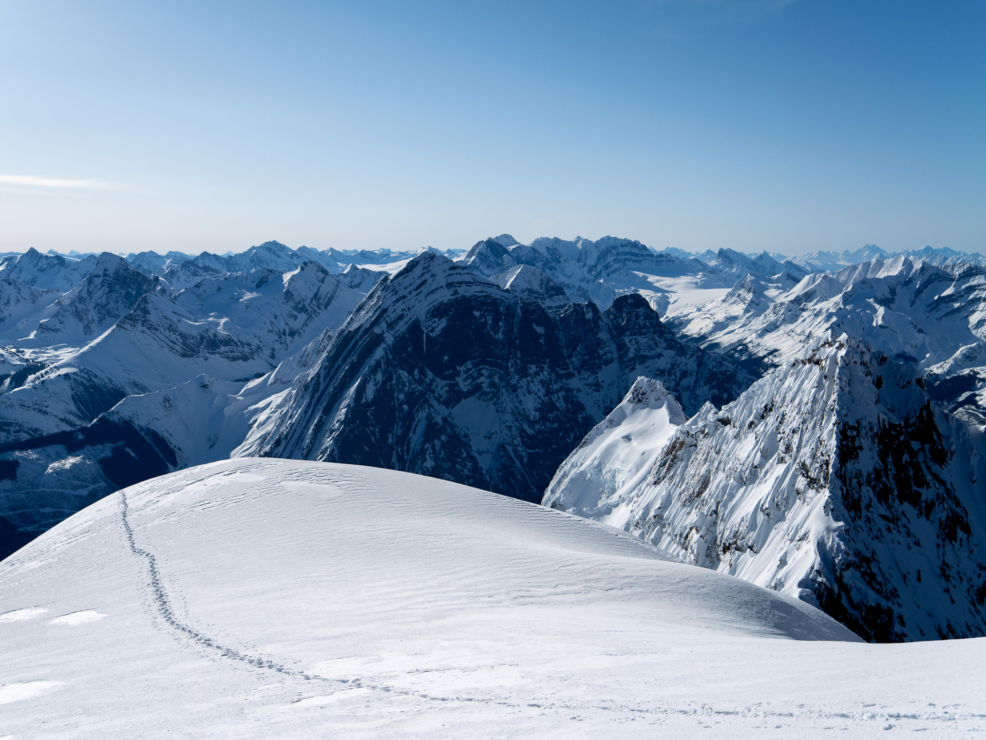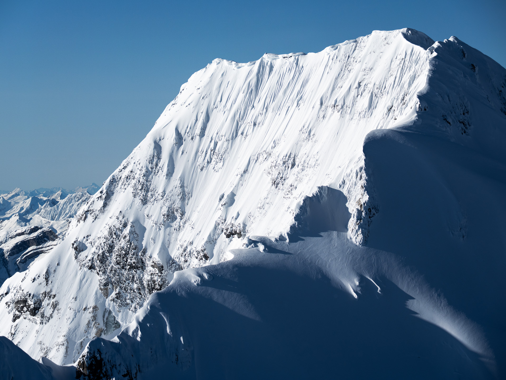 Our route gave us an opportunity to scope out the entrance to the north face, which looked completely reasonable from where we were standing. It does roll pretty steeply, but we had the advantage of beta photos that showed a diagonal halfpipe type feature interrupting the face just out of sight, where things would otherwise have been scariest. With the stoke rapidly building, we topped out on the gorgeous summit ridge with views of Kinbasket Lake and Sir Sandford to the west, Forbes, Mons and the Lyells to the east and a whole lot of huge, spectacular peaks in every other direction.
