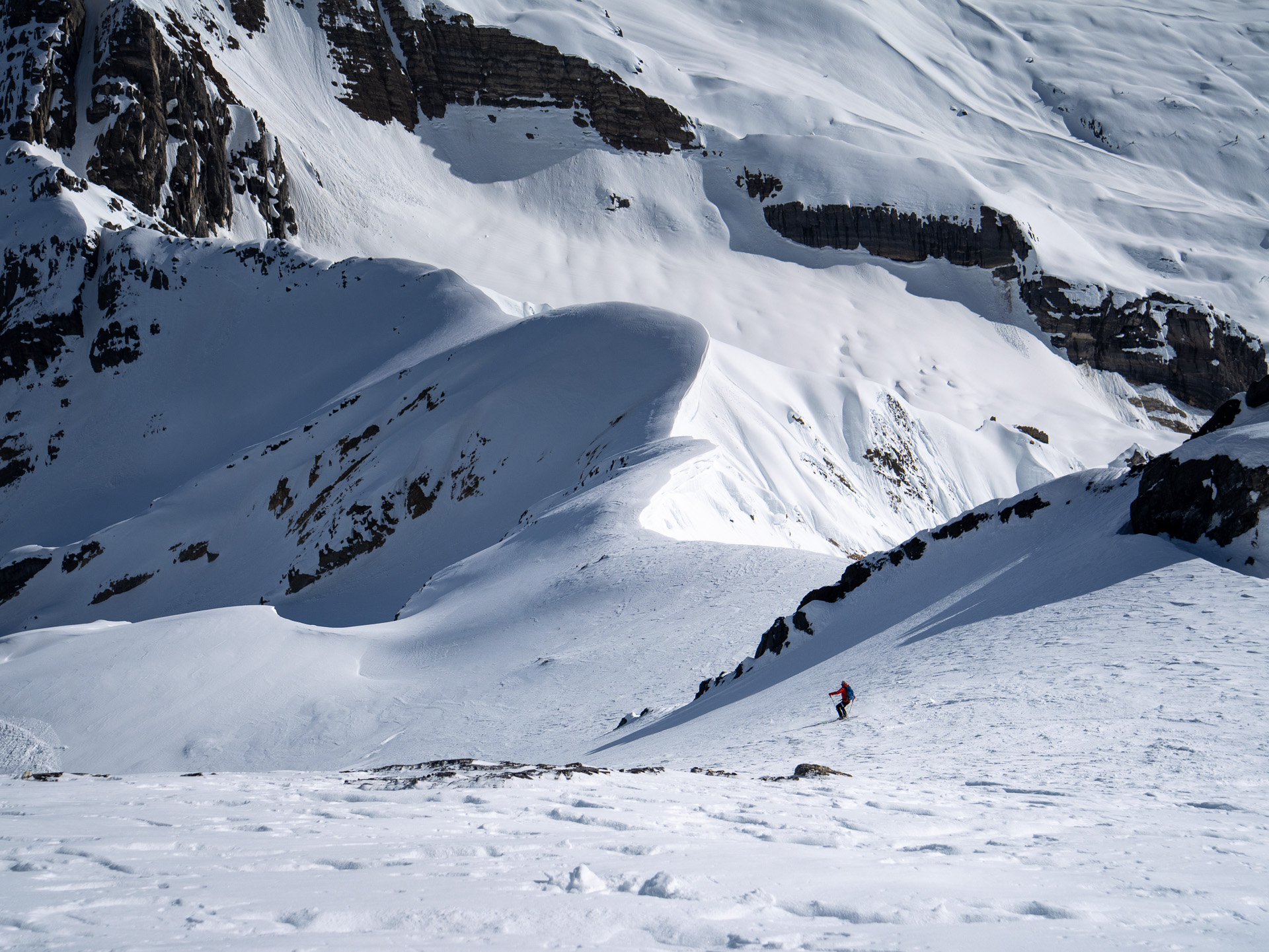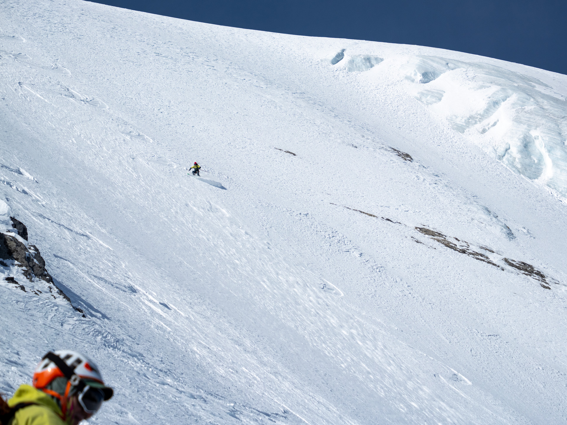 The upper ice face was our primary concern for both stability and thinly buried ice. Ali opened the first few turns a bit to the skier’s right on the ridge. Marcus followed and then Andrew and I felt comfortable sticking to the centre of the face. Nice powder, sloughing fast on a planar alpine face. Can’t beat it. The whole group scooted across the glacial bench to the top of the halfpipe, which we could just about see the entirety of. It was good enough for me, and I got the absolute pleasure of opening the pitch. The snow was so good that it turned into the entire lower face at full speed. What a glorious experience. The pitch was quite moderate, and in those conditions the skiing really didn’t live up to the line’s fearsome reputation.