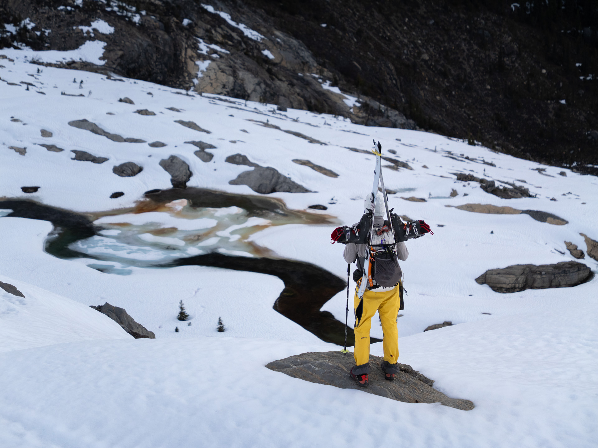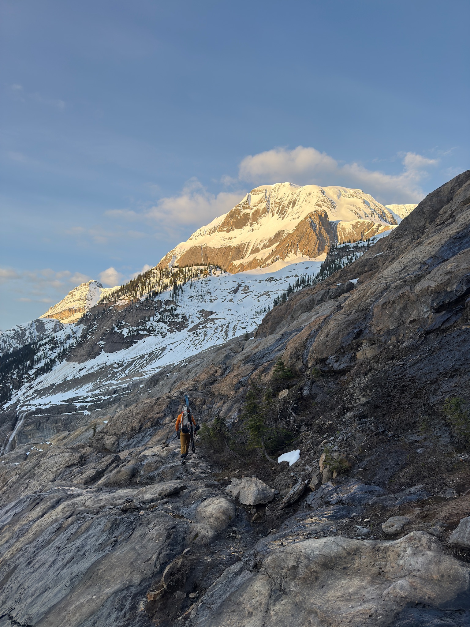 Now satisfied with the day, we started to leave but the day was surely not satisfied with us. A solid 900m of dry, slabby moraine lay below and with heavy packs and tired legs we wanted nothing to do with it. We’d caught a glimpse of avalanche debris over towards Mummery Creek, so we figured we’d try to wring a little extra vert out of that. Some downhill bushwhacking on ten, then five, then two cm of snow ensued, but just when we were about to give up hope, the slide debris appeared.