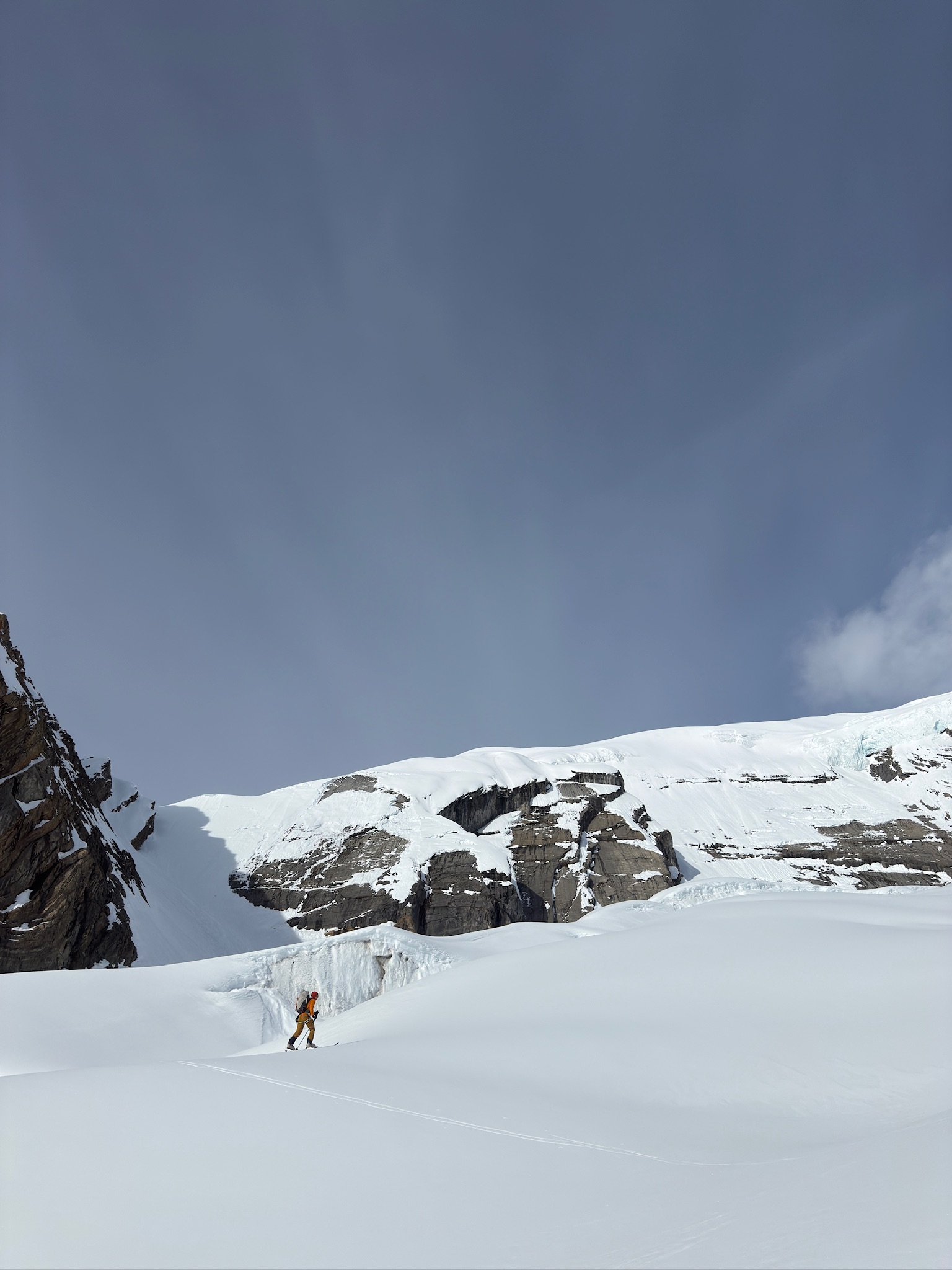 Standing on the summit we had a solid plan, all the beta we were going to get, and a deep desire to open the striking new line we were perfectly positioned for. Below us, the unskied north face began as an intimidating jumble of ice features, then just rolled away. The vast Mummery glacier stretched out far below, while the empty space between echoed the questions on both of our minds. “Are you good enough for this?”, whispered the wind. “Do you think you can pull it off?” called the raven circling overhead. With as much conviction as we could muster, we decided that we were willing to find out. Let me tell you about it.